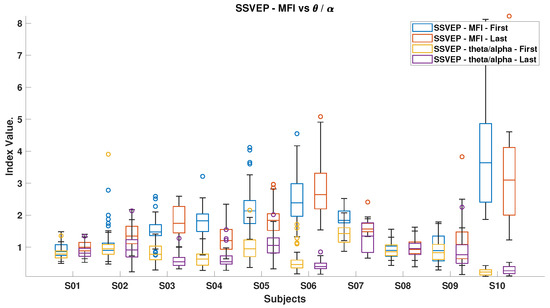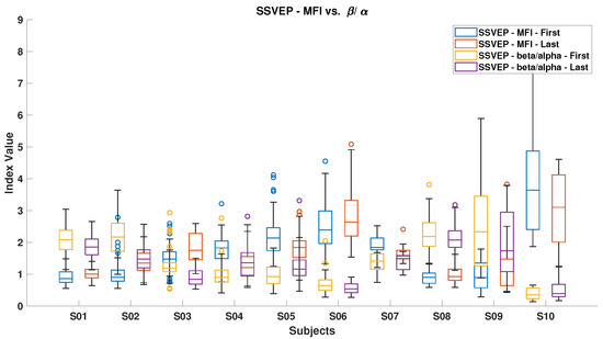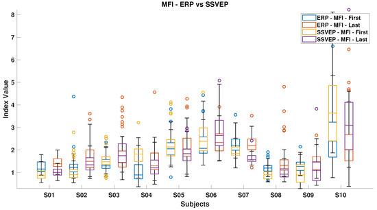 Results from the study reveal notable differences in the MFI across most participants throughout the experiment. However, exceptions were observed with subjects S7 and S10, who displayed higher MFI values initially, which decreased by the experiment’s end. Typically, the overall MFI values for SSVEPs were lower than those for ErrPs among the majority of participants, attributable to the differences in the frequency bands used in the MFI calculations.