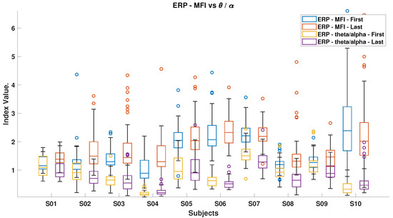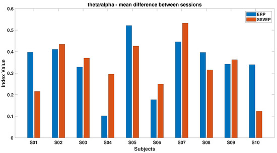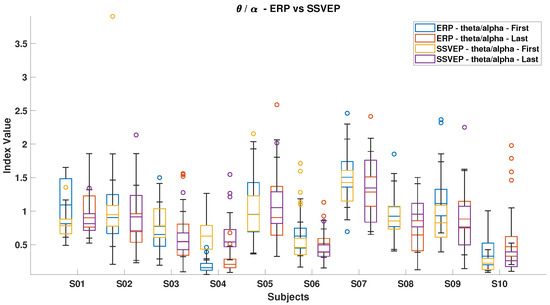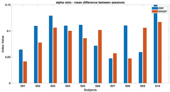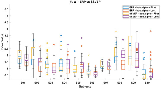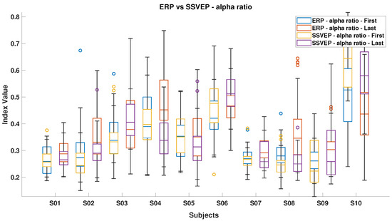Figure 9 shows the Alpha ratio, which generally increased from the start to the end of the experiment for most subjects. Exceptions include S10 during ErrP and subjects S4, S5, and S10 during SSVEP, who did not follow this trend.