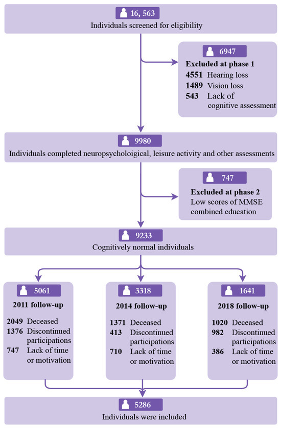 The dataset was sourced from 2008 and 2018, following up on the CLHLS [14]. Participants aged ≥65 years who exhibited no signs of cognitive impairment at baseline were recruited for the study. These individuals had completed an initial survey during 2008–2009 and had participated in at least one follow-up survey conducted in the waves of 2011–2012, 2014, or 2017–2018. A total of 16,563 participants were initially extracted from the 2008 survey. We excluded 4551 individuals with severe hearing impairment, 1489 with severe visual impairment, 747 with cognitive impairment, and 543 without cognitive data at baseline. Additionally, we removed 4440 participants who passed away in 2011, 2014, and 2018 and 2771 individuals who were lost to follow-up. Ultimately, the study included 5286 participants. A flowchart detailing the sample selection process is presented in Figure 1. CLHLS cohort ethics approval was obtained from the Ethics Committee of Peking University (IRB00001052-13074), and all participants provided written informed consent.