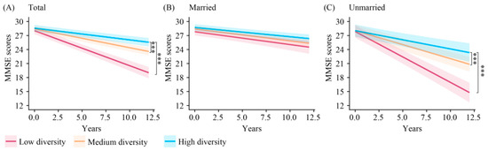 Longitudinal change in cognition among low-, medium-, and high-diversity leisure activity groups in different marital populations. *** p < 0.001. MMSE: Mini-Mental State Examination.