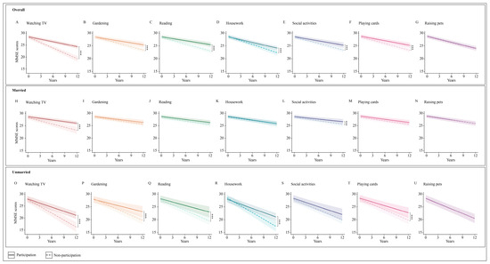 Significant interactions were found among marital status, time, and four types of activity: gardening, reading, household chores, and playing cards. Stratified analysis based on marital status indicated that within the unmarried group, but not in the married group, engagement in gardening (β = 0.299, 95% CI: 0.124–0.475), reading (β = 0.261, 95% CI: 0.086–0.436), household chores (β = 0.345, 95% CI: 0.186–0.504), and playing cards (β = 0.219, 95% CI: 0.059–0.380) were linked to a reduced rate of cognitive decline.
