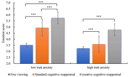 The participant emotional ratings in the LTA and HTA groups after using free viewing, standard cognitive reappraisal, and creative cognitive reappraisal to regulate negative emotions. Error bars represent standard error of the mean. *** p < 0.001.