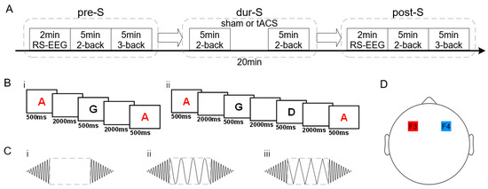 The experiment in this study adopted a randomized, single-blind, controlled experimental design. According to the different stimulus waveform conditions, all 104 participants were randomly divided into three groups, including 38 in the sham stimulation group, 28 in the sine stimulation group, and 38 in the triangular stimulation group. The experiment was conducted in an electromagnetic shielding room. Participants sat calmly and comfortably in the same chair. The experiment consisted of three main parts (Figure 1A). In the pre-stimulation (pre-S) period, 2 min of eyes-open resting-state EEG data were first collected, followed by a behavioral experiment consisting of a 5-min two-back task and a 5-min three-back task for the participants. During the stimulation (dur-S) period, participants received 20 min of electrical stimulation, during which the participants performed a 5-min two-back task twice (2.5–7.5 min and 12.5–17.5 min). The intra-stimulation WM task has shown an enhanced regulatory effect [30,47,48]. In the post-stimulation (post-S) period, the participants underwent the same experimental procedure as in the pre-S period.