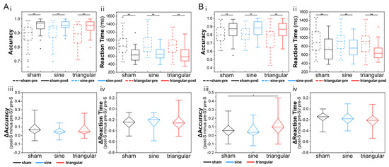 (A) Behavioral performances of participants in two-back WM tasks. (i) Accuracy comparison in pre-S and post-S stages for each group. (ii) RT comparison in pre-S and post-S stages for each group. (iii) The accuracy across the groups. (iv) The RT across the groups. (B) Behavioral performances of participants in three-back WM tasks. (i) Accuracy comparison in pre-S and post-S stages for each group. (ii) RT comparison in pre-S and post-S stages for each group. (iii) The accuracy across the groups. (iv) The RT across the groups. The black lines represent sham stimulation, the blue lines represent sine stimulation, the red lines represent triangular stimulation, dashed lines indicate the pre-S stage, and solid lines indicate the post-S stage (* p < 0.05; ** p < 0.01; = (post-S − pre-S)/pre-S).