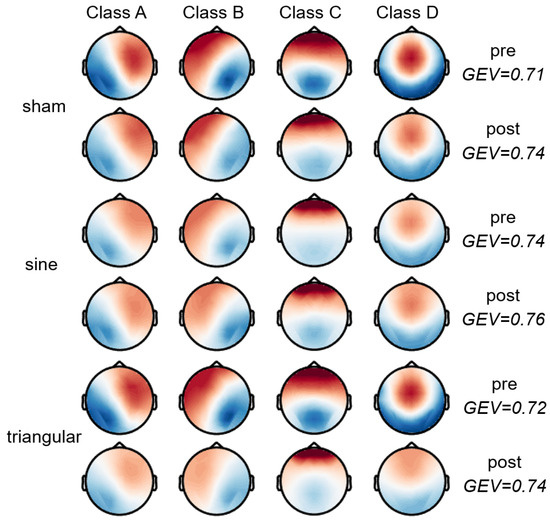 The archetypal four microstate patterns were calculated for each wave group in the pre-S and post-S stages (Figure 3), which were represented as Class A, Class B, Class C, and Class D based on other research studies [34,63,64]. Significant topographical differences between the templates under each condition were not detected through TANOVA. The GEV values were confirmed when the microstate template was back-fitted to the individual data of each condition (pre-sham: 0.71 ± 0.04; post-sham: 0.74 ± 0.05; pre-sine: 0.74 ± 0.06; post-sine: 0.76 ± 0.04; pre-triangular: 0.72 ± 0.04; post-triangular: 0.74 ± 0.05). When using two-sample t-tests, there were no significant differences found in the GEV values between the groups (all p > 0.05).