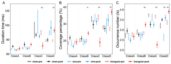 Two-way rmANOVAs for the pre-S stage showed nonsignificant group × microstate class interaction in terms of duration (F(3,303) = 0.834, p = 0.544), coverage (F(3,303) = 0.206, p = 0.975), and occurrence (F(3,303) = 1.857, p = 0.088), while the analysis for the post-S stage showed significant group × microstate class interaction in terms of duration (F(3,303) = 4.093, p < 0.001), coverage (F(3,303) = 4.072, p < 0.001), and occurrence (F(3,303) = 11.04, p < 0.001). Post hoc pairwise group comparisons (Table 2) showed that the sine group had decreased coverage (p = 0.047) and occurrence levels (p = 0.049) for Class A compared with the sham group. The triangular group had increased coverage (p = 0.037) and occurrence levels (p = 0.002) for Class B, decreased duration (p < 0.001), coverage (p = 0.002), and occurrence levels (p < 0.001) for Class C, and increased duration (p = 0.010), coverage (p = 0.002), and occurrence levels (p < 0.001) for Class D compared with the sham group. For the sine and triangular groups, the duration (p = 0.034), coverage (p = 0.010), and occurrence levels (p = 0.005) of Class B, as well as the coverage (p = 0.019) of Class D, increased significantly. The duration (p < 0.001), coverage (p < 0.001), and occurrence levels (p = 0.001) of Class C decreased significantly.