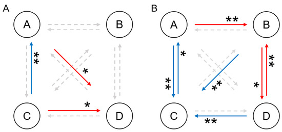 The statistical results of the transition probabilities for the four microstates of the (A) sine and (B) triangular groups. A red arrow indicates that the transition from one microstate to another was significantly increased compared with the pre-S stage, and a blue arrow indicates a significant decrease. The significance markers are the results of a paired t-test after Bonferroni correction (* p < 0.05; ** p < 0.01).
