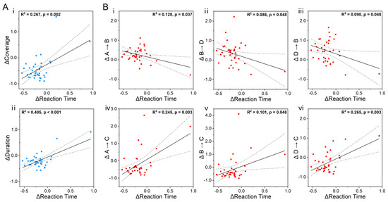 Correlations between triangular stimulation microstate parameters and three-back task behavior parameters. (A) The (i) coverage and (ii) duration of Class C were positively correlated with the RTs. (B) The transition probabilities of (i) A → B, (ii) B → D, and (iii) D → B were negatively correlated with the RTs, while those of (iv) A → C, (v) B → C, and (vi) D → C were positively correlated with the RTs. Each dot indicates the data of each participant. The range outlined by the dashed lines indicates the 95% confidence interval, and the solid lines represent linear regression. = (post-S − pre-S)/pre-S.