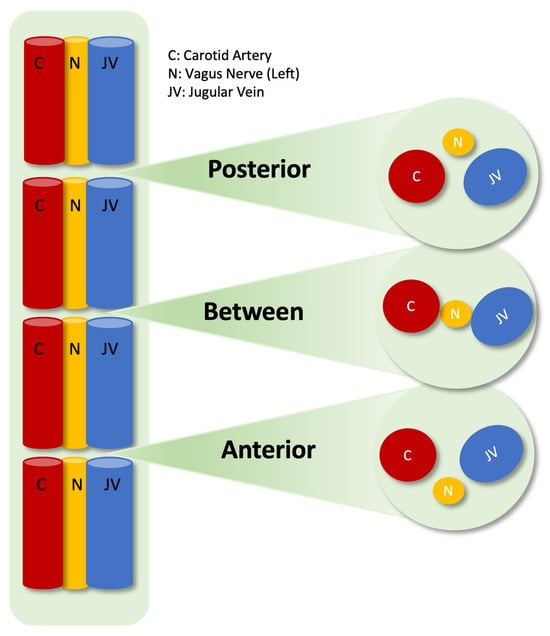 - Planitzer, U.; Hammer, N.; Bechmann, I.; Glätzner, J.; Löffler, S.; Möbius, R.; Tillmann, B.N.; Weise, D.; Winkler, D. Positional Relations of the Cervical Vagus Nerve Revisited. Neuromodulation 2017, 20, 361–368. [Google Scholar] [CrossRef] [PubMed]