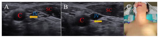 (A) is neutral position, while (B) is 15-degree right rotation. Patient is operated on in neutral position (C). (C: carotid artery; JV: jugular vein; SC: sternocleidomastoid muscle; Arrow: nervus vagus).
