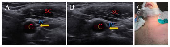 (A) is neutral position, while (B) is 15-degree right rotation. Patient is operated on in 15-degree right rotation position, as seen in (C). (C: carotid artery; JV: jugular vein; SC: sternocleidomastoid muscle; arrow: nervus vagus).
