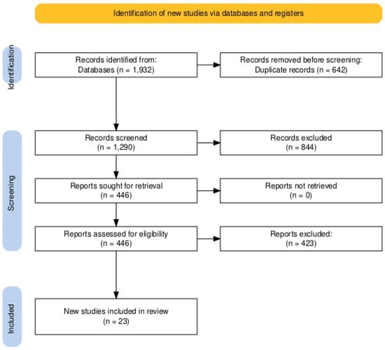 The systematic literature search yielded a total of 1932 records. After removing duplicates, 1290 unique citations were screened. Of these, 121 full-text articles were assessed for eligibility, and 23 systematic reviews and meta-analyses were included in the final synthesis.