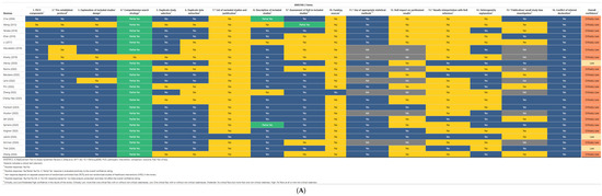 Two review authors (A.B. and A.K.) appraised the gathered literature using AMSTAR-2 [11,12]. The quality appraisal of the literature using AMSTAR-2 involved a rigorous assessment of systematic reviews based on 16 key domains. These domains cover crucial aspects of review methodology, including protocol registration, search strategy comprehensiveness, risk of bias assessment, and methods of data extraction [11,12]. Seven of these domains were designated as “critical”, carrying greater weight in the overall appraisal. AMSTAR 2 does not generate a numerical score, but provides an overall rating of “high”, “moderate”, “low”, or “critically low” based on the number of “no” responses for each domain. This rating reflects the methodological rigor and trustworthiness of the reviewed systematic reviews, aiding in the identification of high-quality evidence for clinical decision-making and research [11,12]. The results were visualized using amstar2Vis [11,12].