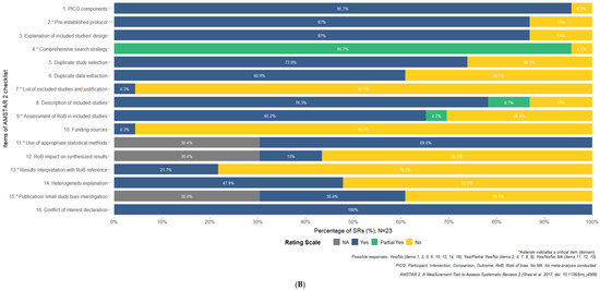 AMSTAR-2 grading for each review study individually (A) and for the whole dataset (B) [1,2,3,4,5,6,7,8,9,11,14,15,16,17,18,19,20,21,22,23,24,25,26].