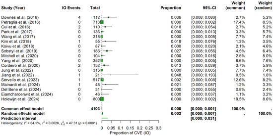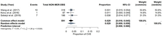 - Perioperative period: Separate random-effects meta-analyses were conducted to estimate the probability of intraoperative (IO) and postoperative (PO) CVEs, using the total number of DBS patients per study as the denominator. Note that variability in the definition of the PO period may contribute to heterogeneity in these estimates.