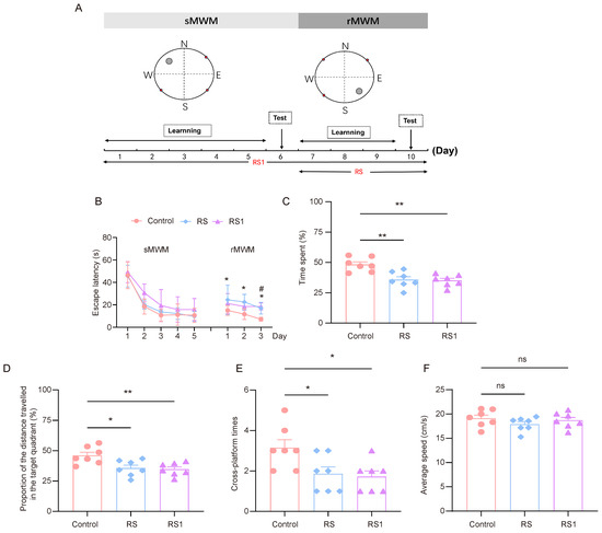 Cognitive flexibility impairment induced by restraint stress. (A) Time course of restraint stress and MWM test. (B) Changes in escape latency in sMWM and rMWM learning tasks in the control, RS, and RS1 groups (n = 7, two-way ANOVA with Tukey’s post hoc test vs. Rs; # p < 0.05 vs. RS1 * p < 0.05). (C) In the rMWM test task, the proportion of time that the mouse spent in the target quadrant compared to the total time, (n = 7, one-way ANOVA with Tukey’s post hoc test, ** p < 0.01). (D) In the rMWM test task, the proportion of distance traveled by the mouse in the target quadrant compared to the total distance traveled (n = 7, one-way ANOVA with Tukey’s post hoc test, ** p < 0.01, * p < 0.05). (E) The number of times the platform was crossed in the target quadrant during the rMWM test task (n = 7, one-way ANOVA with Tukey’s post hoc test, * p < 0.05). (F) The average moving speed of the mice during the rMWM test task (n = 7, one-way ANOVA with Tukey’s post hoc test, ns p > 0.05).