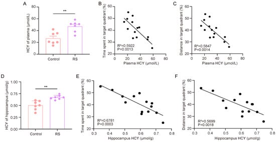 First, we measured the HCY levels in the plasma and hippocampus of the mice. The ELISA results showed that the HCY levels in the plasma and hippocampus of RS group mice were significantly increased (Figure 3A,D). After that, we analyzed the correlation between the HCY content in mouse plasma and the hippocampus and the proportion of time spent in the target quadrant where the escape platform was located and the proportion of distance traveled in the target quadrant compared to the total distance travelled (Figure 3B,C,E,F). It was found that the performance of the mice in the rMWM test task was negatively correlated with the content of HCY in peripheral plasma and the hippocampus.