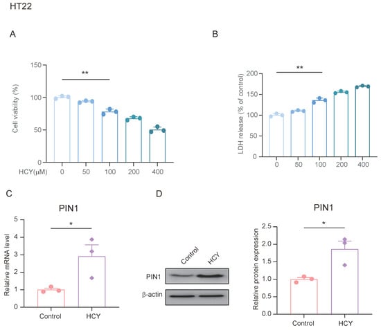 HCY induces an increase in PIN1 expression in HT22 cells. (A) HT22 cells were treated with the indicated concentrations of HCY for 24 h, and cell growth was evaluated using a cell counting kit-8 (CCK-8) assay, in regard to three independent experiments. The values are presented as means ± SD (n = 3). Statistical analysis was performed using a one-way ANOVA; ** p < 0.01. (B) HCY induced lactate dehydrogenase (LDH) release in HT22 cells. The values are presented as means ± SD (n = 3). Statistical analysis was performed using a one-way ANOVA; ** p < 0.01. (C) The mRNA expression of PIN1 in HT22 cells (n = 3, Student’s t-test, * p < 0.05). (D) The protein expression of PIN1 in HT22 cells (n = 3, Student’s t-test, * p < 0.05).