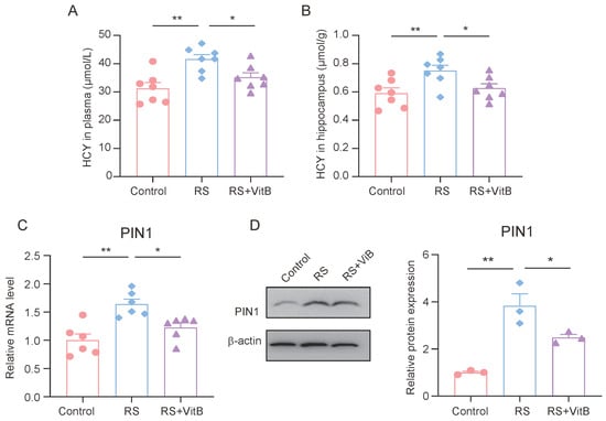 At the same time, we detected the HCY content in the plasma and hippocampus of the mice. The ELISA results showed that VitB could ameliorate the increase in HCY in plasma and the hippocampus induced by restraint stress in mice (Figure 5A,B). In addition, we also detected the expression of PIN1 in the hippocampus of mice. It was found that VitB could also inhibit the high expression of PIN1 in the hippocampus of mice induced by restraint stress (Figure 5C,D).