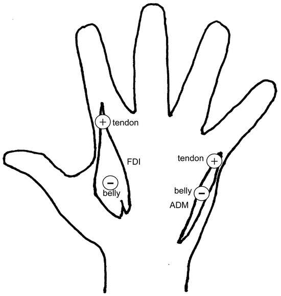 FDI is the prime mover of the index finger abduction, but the abductor digiti minimi muscle (ADM) is that of the little finger abduction. While the index finger moves independently, the little finger moves with the other fingers [37,38,39,40]. To examine the different roles of the interaction between the independent and dependent fingers, the surface electrodes recording the EMG were placed over the right FDI and ADM with belly-tendon montages (Figure 1). To reduce the impedance level of the electrode sites, an experimenter rubbed the sites with abrasive electrolytic gel.