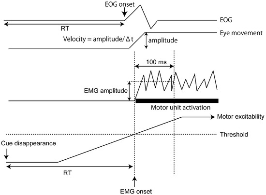 The EMG traces were fully rectified for the data analysis. The EMG and EOG onset was defined as the time of the earliest rise in the response [41]. The onset of EMG was determined by visual inspection in previous studies [41,42,43,44]. The difference in mean and standard deviation of the response onset when the EMG onset was determined visually and when determined by the automatic detection methods was small [45]. The slope of the regression line between the EMG onset via visual inspection and that via computer-based determination was 0.999 [41]. The intra-rater reliability (test-retest reproducibility within each rater) of the visual determination of the onset of the electromyographic burst was high (ICC3,1 = 0.992) [46]. Accordingly, visual inspection of the EMG onset is as reliable as the algorithm-based determination [41,47]. In a previous study, authors stated that the determination of the EMG onset via algorithm is not sensitive, and thus, visual determination of the EMG onset is recommended [48]. Accordingly, in the present study, the EMG onset, as well as the EOG onset, was visually determined by an experimenter in all trials across the participants. RT was defined as the interval between the time of the disappearance of the preparation cue and EMG or EOG onset. Saccade amplitude was estimated on a base-to-peak basis. The average velocity of the saccade eye movement in the time window between the onset and peak of the eye movement was estimated. The RT of the EOG response was defined as the time between the cue onset and EOG response onset. The RT of the EMG response was defined as the time between the cue onset and the EMG response onset. The rectified EMG amplitude in the time window 0–100 ms after the disappearance of the preparation cue was averaged (Figure 2). The median of the data was used for each task.