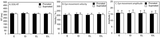 The raw traces of the eye movement, EOG response, and EMG response are shown in Figure 3. The RT of the EOG response is shown in Figure 4A. There was no significant interaction between the main effect of the task and that of forearm position [F (3, 42) = 0.312, p = 0.817]. There was no significant main effect of forearm position [F (1, 14) = 0.057, p = 0.815] and task [F (3, 42) = 0.715, p = 0.549]. The velocity of the saccade eye movement is shown in Figure 4B. There was no significant main effect of either task [F (3, 42) = 1.291, p = 0.290] or forearm position [F (1, 14) = 0.000, p = 0.989]. There was no significant interaction between the main effect of task and that of forearm position [F (3, 42) = 0.671, p = 0.575]. The amplitude of the eye movement is shown in Figure 4C. There was no significant interaction between the main effects [F (3, 42) = 1.706, p = 0.180]. There was no significant main effect of forearm position [F (1, 14) = 1.184, p = 0.295] and task [F (3, 42) = 1.887, p = 0.146].