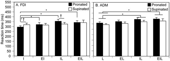 Reaction time of FDI and ADM. Data points indicate means and error bars indicate the stand error of the means. Each asterisk indicates the significant difference between the tasks (p < 0.05). Each dagger indicates a significant difference between forearm positions (p < 0.05).