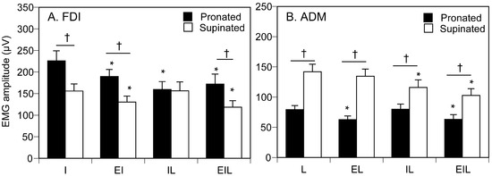 EMG amplitude of FDI and ADM. Data points indicate means and error bars indicate the stand error of the means. Each asterisk indicates a significant difference from I or L task (p < 0.05). Each dagger indicates a significant difference between forearm positions (p < 0.05). FDI, first dorsal interosseous muscle; ADM, abductor digiti minimi.
