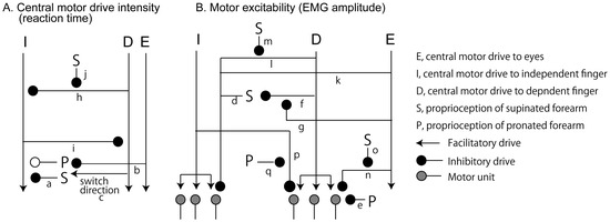 The simple RT in the present study represents the time required to reach the excitability of the motor units to the threshold caused by the central motor drive, and thus, reflects the intensity of the central motor drive. Figure 7A illustrates the model, derived from simple RT results, that describes how the central motor drive to one muscle affects the intensity of the drive to another. First, in the pronated forearm position, FDI-RT was significantly longer when either the little finger movement (IL task) or the little finger and eye movements (EIL task) were additionally involved. Second, regardless of forearm position, ADM-RT was significantly longer when the index finger movement (IL task) or the index and eye movements (EIL task) were additionally involved. The commonly added movement causing the increase in the RT was the movement of the finger other than the examined one (i.e., little finger movement for FDI-RT and index finger movement for ADM-RT). Thus, the present finding indicates that the central motor drive to one finger muscle is suppressed by the central motor drive to the other finger muscle. This suggests a mutual inhibitory interaction between the central motor drives to the independent and dependent finger muscles (Figure 7h,i).