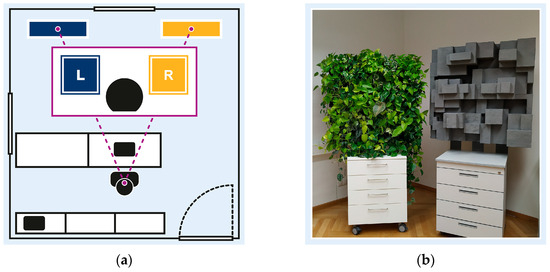 Experimental setting: (a) experimental room and participants’ visual field, with neutral stimulus in left periphery (L), and experimental stimulus in right periphery (R); (b) experimental stimuli including nature-inspired design element (left) and urban-inspired design element (right).
