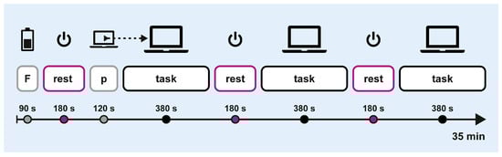 Crossover sessions followed the protocol outlined in Figure 3. Each session started with a 90 s fatigue induction phase, during which participants completed a cognitive loading task in paper-and-pencil format. This was followed by a block-design trial consisting of six alternating blocks of off-screen breaks (3 × 180 s) and computerised attention tasks (3 × 380 s). At the start of the first task block, participants completed a 120 s training block to practice the computerised task. The total duration was approximately 35 min.