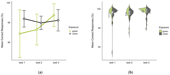 ANT correct responses (%) across task blocks and design conditions (green vs. urban): (a) mean changes over time with CIs; (b) distribution and variability of observations across task blocks, medians with IQRs (centre), means, and CIs (periphery).
