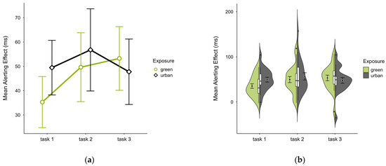 ANT alerting effect (ms) across task blocks and design conditions (green vs. urban): (a) mean changes over time with CIs; (b) distribution and variability of observations across task blocks, medians with IQRs (centre), means, and CIs (periphery).