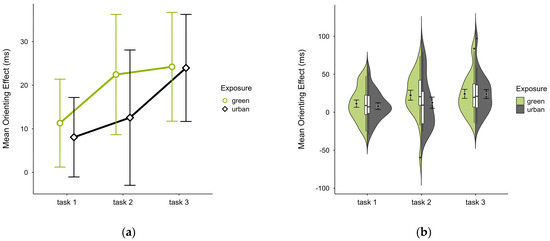 ANT orienting effect (ms) across task blocks and design conditions (green vs. urban): (a) mean changes over time with CIs; (b) distribution and variability of observations across task blocks, medians with IQRs (centre), means, and CIs (periphery).