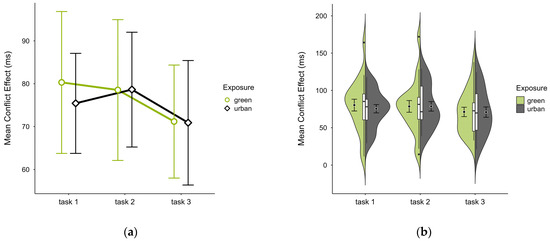 ANT conflict effect (ms) across task blocks and design conditions (green vs. urban): (a) mean changes over time with CIs; (b) distribution and variability of observations across task blocks, medians with IQRs (centre), means, and CIs (periphery).