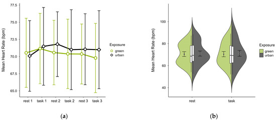 Heart rate (bpm) across trial blocks (rest, task) and design conditions (green vs. urban): (a) mean changes over time with CIs; (b) distribution and variability of observations across task blocks, medians with IQRs (centre), means, and CIs (periphery).