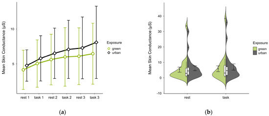 Skin conductance (μS) trial blocks (rest, task) and design conditions (green vs. urban): (a) mean changes over time with CIs; (b) distribution and variability of observations across task blocks, medians with IQRs (centre), means, and CIs (periphery).