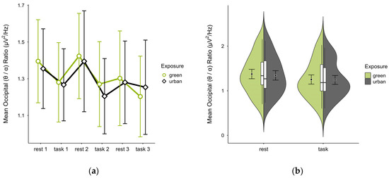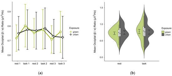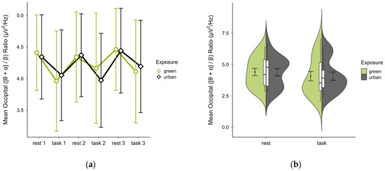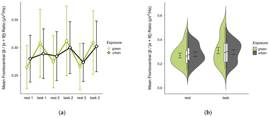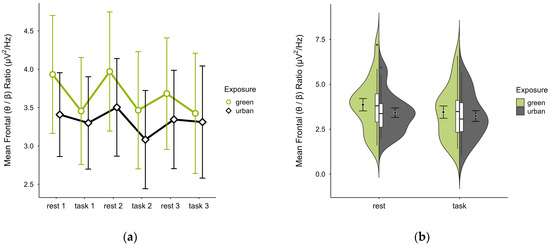 Frontal (θ/β) ratio across trial blocks (rest, task) and design conditions (green vs. urban): (a) mean changes over time with CIs; (b) distribution and variability of observations across task blocks, medians with IQRs (centre), means, and CIs (periphery).