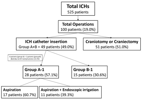 Among them, 49 patients (25 men and 24 women) underwent ICH catheter insertion at our institution. Of these, 32 patients underwent ICH catheter insertion with intentional aspiration (Group A) and initial volume measurement. Volume was manually calculated using the ZeTTA picture archiving and communication system (PACS) (Taeyong Soft Co., Ltd., Gwacheon, Gyeonggi Province, Republic of Korea). Twelve patients in Group A (37.5%) underwent additional endoscopic irrigation through the same trajectory as the ICH catheter. Unlike endoscopic evacuation procedures at other institutions, our approach used a ventriculoscope in a limited manner, prioritizing re-bleeding prevention while irrigating only non-viscous fluid. Seventeen patients (Group B) underwent ICH catheter insertion without intentional aspiration or endoscopic irrigation. One or two ICH catheters were inserted, with two being more frequently used in Group B (p = 0.008) (Table 1). Among the 49 patients who underwent ICH catheter insertion, 6 (12.2%) patients died within one month postoperatively due to complications. Outcomes according to surgical method were analyzed in 28 patients from Group A (Group A-1) and 15 patients from Group B (Group B-1) (Figure 1).