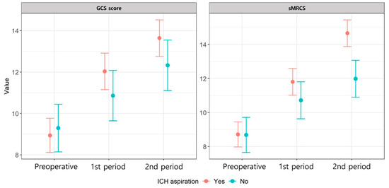 Linear mixed models were used to calculate the beta coefficient and 95% confidence interval for improved the GCS score and motor function. Data on the baseline GCS score, sMRCS score, ICH aspiration, sex, age, location, initial ICH volume, surgery type, presence of intraventricular hemorrhage (IVH), number of ICH and EVD catheters, medical history, time from symptom onset to surgery, postoperative alteplase use, and preoperative anticoagulant use were considered as independent variables in the linear mixed model analysis. Univariable analysis was first conducted on these independent variables, and those with p-values below 0.05 were included in the multivariable analysis. In the multivariable analysis, we assessed the interaction effect of ICH aspiration and time, calculating least-squares mean values to compare improvements in the GCS scores and motor function postoperatively. A two-sided p-value below 0.05 was considered statistically significant. All statistical analyses were performed using the R software (version 4.4.1; R Foundation for Statistical Computing, Vienna, Austria).