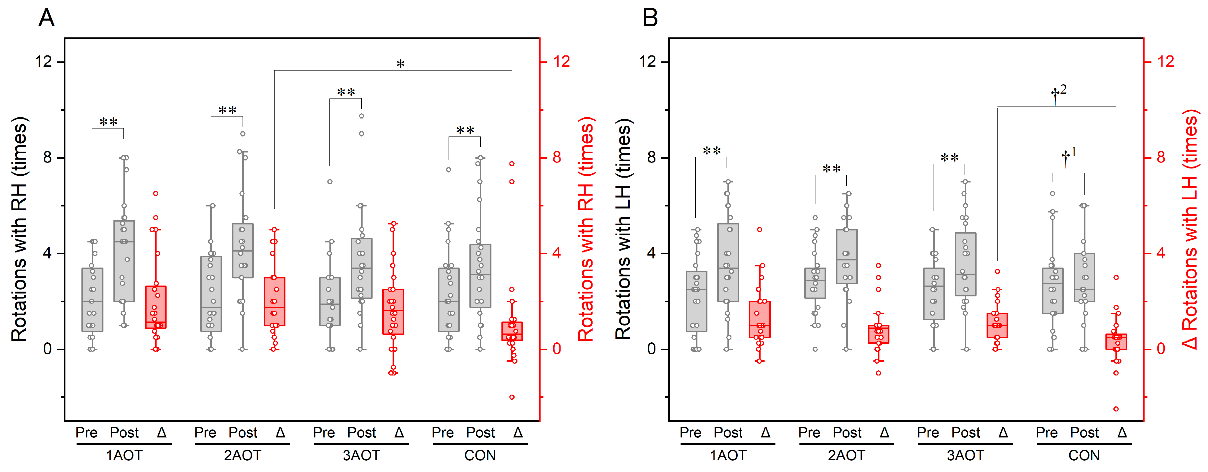 Maximum number of rotations in 20 s in the ball rotation task. (A) Maximum number of rotations with the right hand (intervention hand). (B) Maximum number of rotations with the left hand (non-intervention hand). RH, right hand; LH, left hand; AOT, action observation therapy; 1AOT, one-minute observation duration of AOT; 2AOT, two-minute observation duration of AOT; 3AOT, three-minute observation duration of AOT; CON, control condition (two-minute observation of geometric pattern); Pre, pre-intervention; Post, post-intervention; Δ, change in the maximum number of rotations (Post-Pre). *, Bonferroni adjusted p < 0.05; **, p < 0.01; †1, p = 0.052, r = 0.40; †2, p = 0.113, r = 0.48.