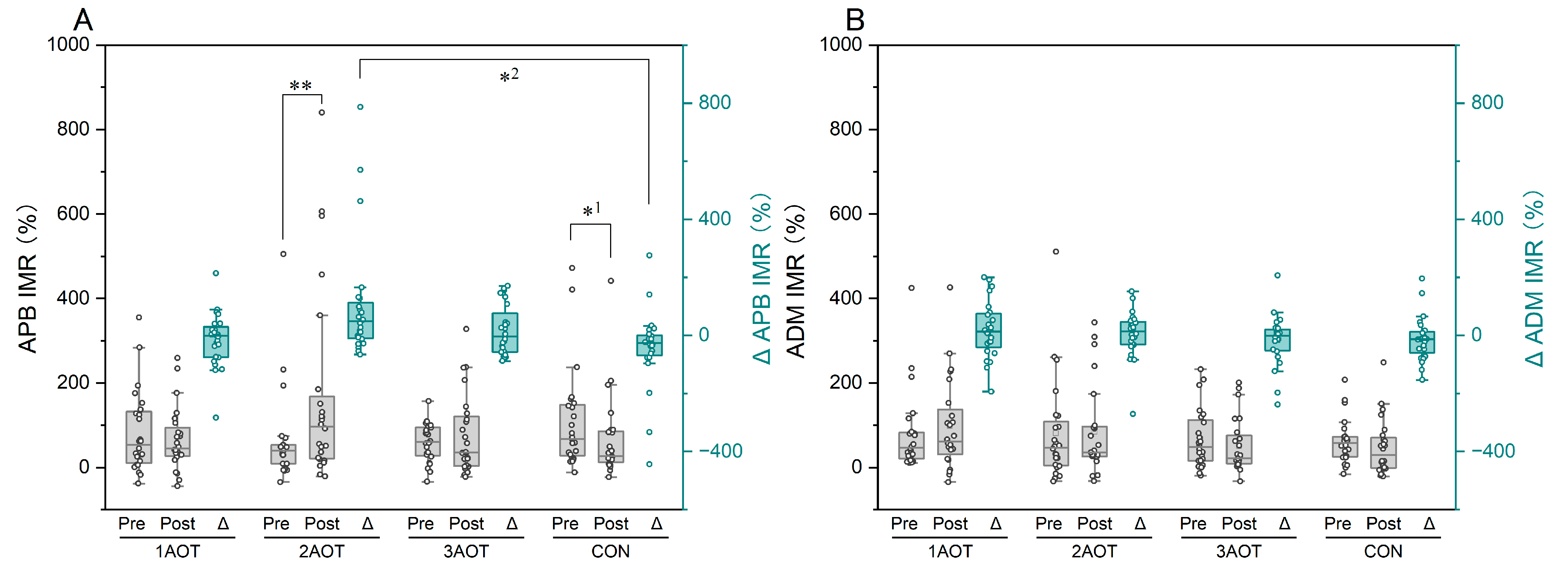 Interpersonal motor resonance. (A) IMR of APB. (B) IMR of ADM. AOT, action observation therapy; 1AOT, one-minute observation duration of AOT; 2AOT, two-minute observation duration of AOT; 3AOT, three-minute observation duration of AOT; CON, control condition (two-minute observation of geometric pattern); Pre, pre-intervention; Post, post-intervention; Δ, change in the maximum number of rotation (Post–Pre). *1, p < 0.05; **, p < 0.01; *2, Bonferroni adjusted p < 0.05.