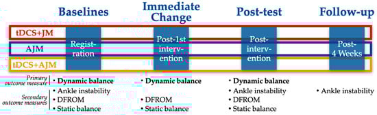 As studies highlighting improved balance capabilities resulting from cortical excitability regulation through non-invasive stimulation emerged, research investigating the effects of tDCS increased. This study aimed to examine the effects of tDCS combined with JM and AJM on adults with CAI. Assessments were conducted at baseline, immediate, post-intervention, and 4-week follow-up to determine whether the combined interventions would yield more effective outcomes.