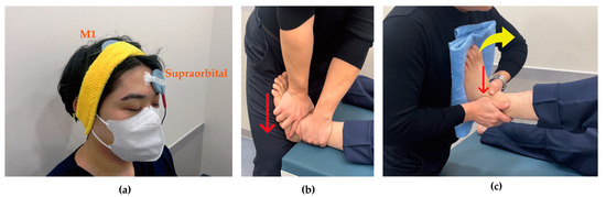 tDCS was administered using The Brain Driver tDCS v2.1 (The Brain Driver Inc., Chicago, IL, USA). The equipment used in this study was identical to that employed in previous research, thus ensuring proven safety and reliability [27,28]. The electrode sponges were moistened with 0.9% physiological saline solution. The anodal electrode was attached to C3 or C4 according to the 10/20 international EEG system to stimulate primary motor cortex (M1) contralateral to the side of ankle instability, while the cathodal electrode was placed on the supraorbital region ipsilateral to the instability [29]. Stimulation was applied at an intensity of 2 mA for 15 min [24] (Figure 2a).