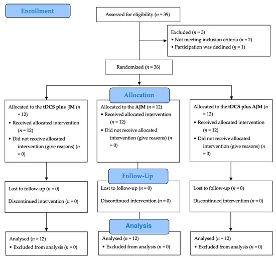 Figure 3 shows a flow chart of this study based on the Consolidated Standards of Reporting Trials (CONSORT) guidelines. Of the 39 potential participants initially screened for eligibility, three were excluded (two did not meet the inclusion criteria and one declined participation). The remaining 36 participants were randomly assigned in equal numbers to one of three intervention groups: tDCS + JM (n = 12), AJM (n = 12), and tDCS + AJM (n = 12). All the participants received their allocated interventions, with no participants lost to follow-up or discontinuation of the intervention in any group. All the 36 enrolled participants (12 in each group) were included in the final analysis.