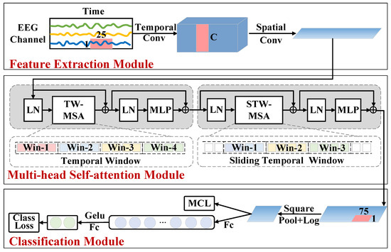 For subject-independent EEG recognition, a temporal sliding window transformer (SWT) is proposed to achieve high temporal resolution in feature extraction while maintaining manageable computational complexity. The overall architecture of the SWT model consists of three parts: a feature extraction module, a multi-head self-attention module, and a classification module, as shown in Figure 1.