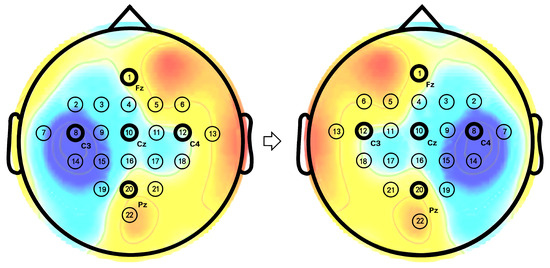 The mirror EEG signal is constructed to increase the number of negative sample pairs in the mirror contrastive learning. This is achieved by swapping the EEG channels between the right and left brain hemisphere regions to create the mirror EEG signals [8,33], as shown in Figure 3. For instance, the data from the original C3 channel is exchanged with the C4 channel, and vice versa. The electrode positions of the mirror EEG signals are the same as those of the original EEG signals in a mirror, hence the term “mirror EEG signals”. This approach ensures that the ERD/ERS phenomenon appears on the contralateral side when comparing the mirror EEG signal with the original EEG signal. Additionally, it is crucial to assign the opposite label to the mirror EEG signal relative to the original EEG signal. For example, if the original EEG label is “left hand”, the label for the mirror EEG signal will be “right hand”.