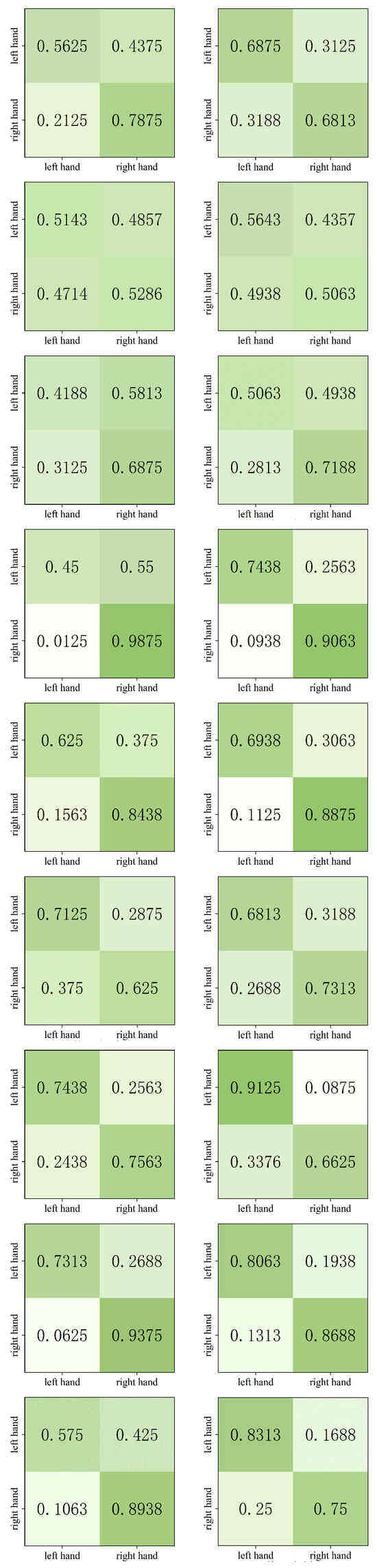 Confusion matrices for SWT (left) and MCL-SWT (right) across nine subjects in dataset IIb.