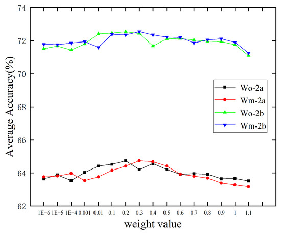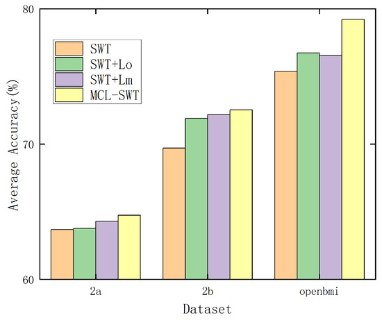 Equation (12) consists of two components: the first term, , represents the contrastive loss within the original EEG signals, while the second term, , corresponds to the contrastive loss between the original EEG signals and their mirror counterparts. To evaluate the effectiveness of each component, ablation experiments were conducted on datasets IIa and IIb, with the results presented in Figure 8. For preprocessing, a “4–38 Hz” band-pass filter was applied. As shown in Figure 8, both and individually contribute to improving the average classification accuracy of the SWT model. Moreover, the combination of and further enhances the model’s performance, demonstrating the complementary benefits of incorporating both components.