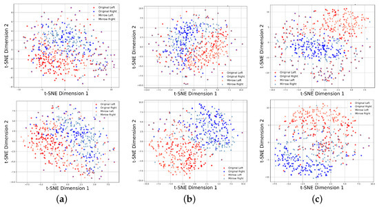 To assess the impact of MCL on feature distribution, the features were visualized using t-SNE [40], with the results for subjects 4, 5, and 8 from dataset IIb shown in Figure 7. In these visualizations, the original EEG signals are represented as circles, while the mirror EEG signals are depicted as triangles. The left-hand MI is shown in red, and the right-hand MI is shown in blue.